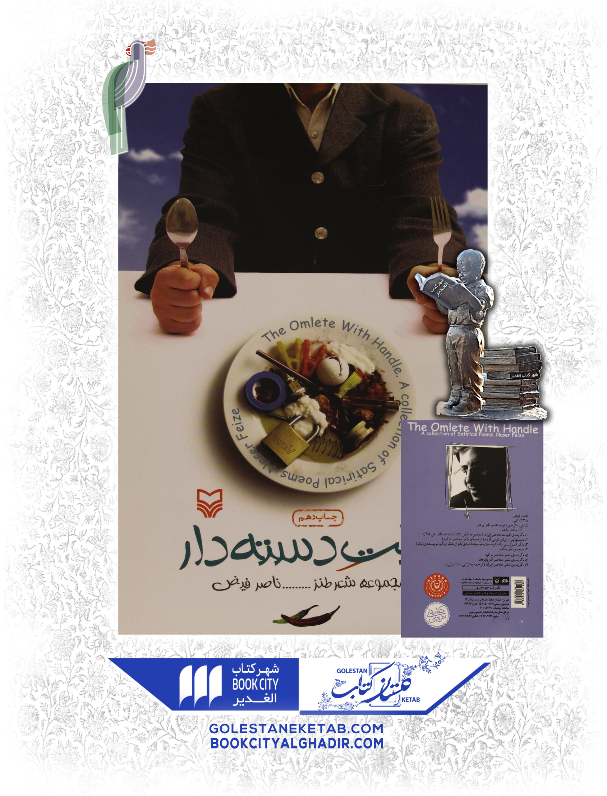 ناصر فیض شاعر، مترجم، نویسنده و طنزپرداز است که چهار کتاب از وی چاپ و سه کتاب گزیدة اشعار شعر معاصر ترکیه، شعر معاصر آذربایجان، شعر معاصر ایران (ترجمه به ترکی استانبولی) را در دست چاپ دارد. املت دسته دار مجموعه شعر طنزی از اوست. «املت دستهدار» را باید شاخصترین اثر ناصر فیض بدانیم؛ هرچند اگر او خود کارهای دیگرش را دوست داشته باشد! با این حال، مجموعه کارهایی که قرار نبود برای چاپ از زیر دست طنزپرداز نامدار کشورمان خارج شود، به نحوی مرتب شد و به قول خودش ریز و درشتشان کرد تا در قالب کتابی با همین عنوان به دست مخاطب برسد. او در مقدمه کوتاه و طنز کتاب از ماجرای چاپ این آثار سخن میگوید و معتقد است که طنزپرداز باید رو داشته باشد تا قریحهاش رو بیاید و این رو داشتن هیچ مناسبتی با پررو بودن ندارد. او در همین چند سطر، دفتر طنز حوزه هنری را هم معرفی کرده و چاپ آثار جوانترها را وزش هوای تازه خوانده است. شعرهای «املت دستهدار»، طنز روراست، صریح و البته اخلاقی است. به اوضاع و احوال سیاسی کشور، اشارههای روشن و باصراحتی دارد که شاید نشود همین مفاهیم را از زبانی غیر از زبان طنز شنید. با این حال، شیرینی سرودههای ناصر فیض به اندازهای است که طعم گس انتقاد، در کام خواستاران ننشیند. برخی عناوین اشعار موجود عبارتند از: غزل مدرن، گریه کردن، فهمید بد شد، در طلب حج، اختلاف، دلبر بیاستخوان، به دنبال قافیه، آن قدر است نیست، املت دستهدار، یه لقمه نون، قصیده داش غلام، در خرابی قم، اسباب هنر و…