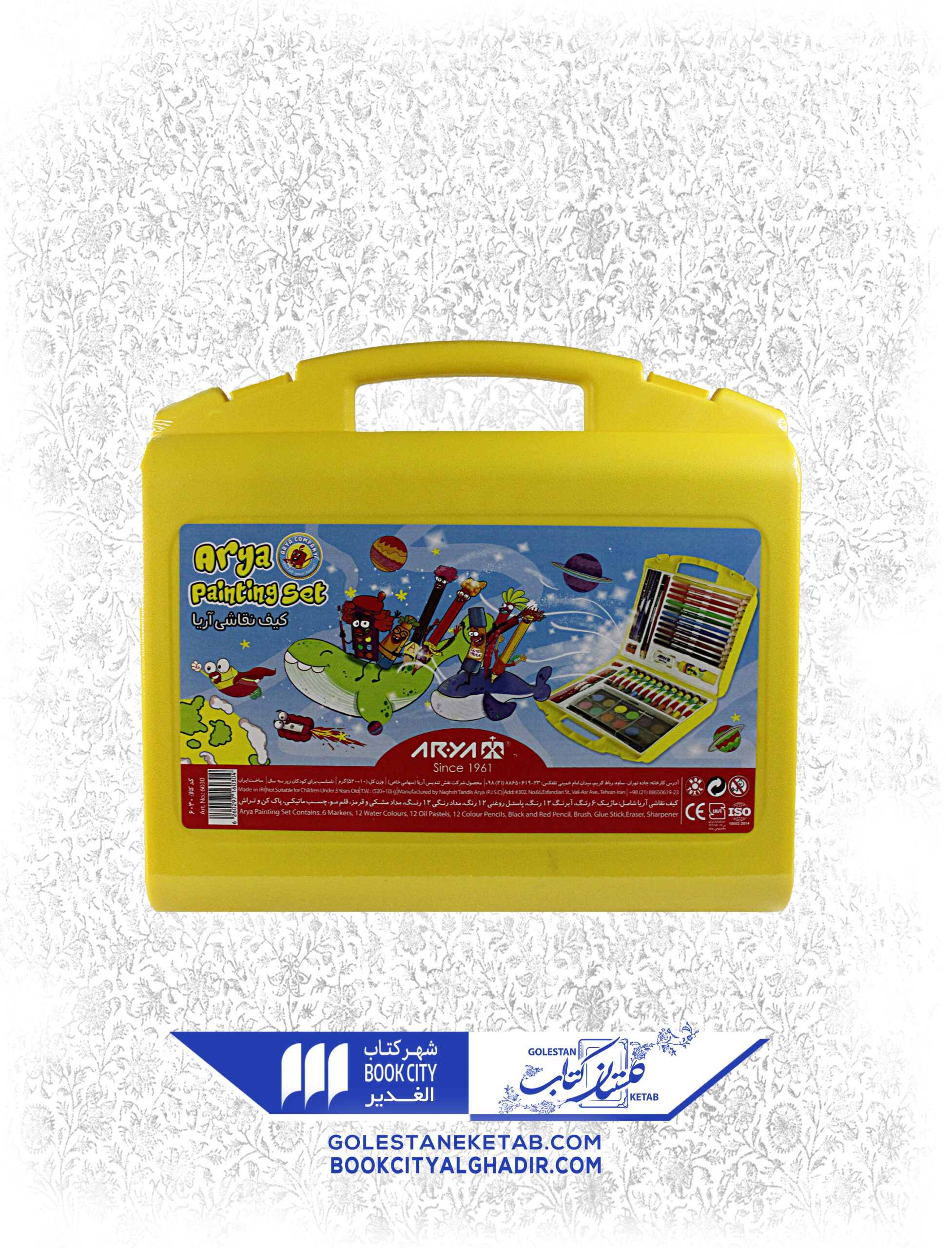 کیف نقاشی آریا شامل ماژیک ۶ رنگ-آبرنگ ۱۲ رنگ-پاستل روغنی ۱۲ رنگ-مداد رنگی ۱۲ رنگ-مداد مشکی و قرمز-قلم مو -چسب ماتیکی-پاک کن و تراش